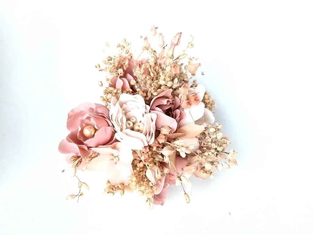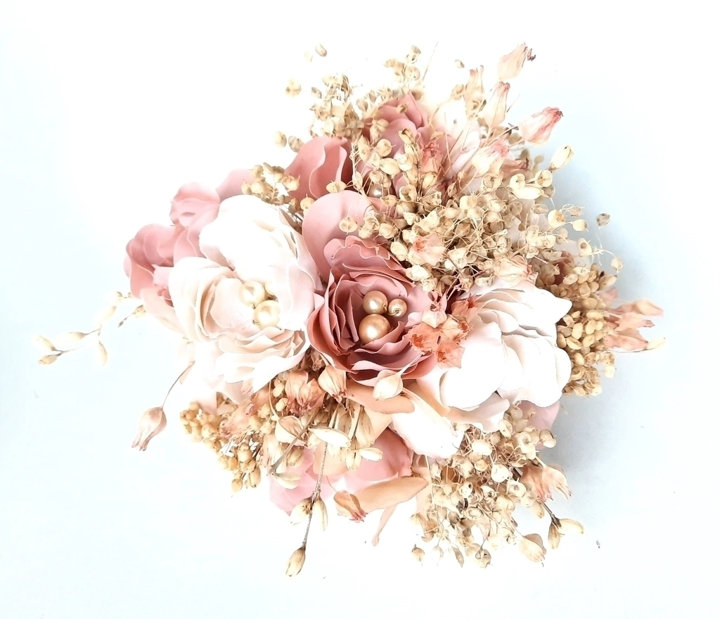 Ramo de flores moldeadas rosa nude y natural con perlas, flores de nácar y preservadas. Medidas: Diámetro 18 a 20 cm.